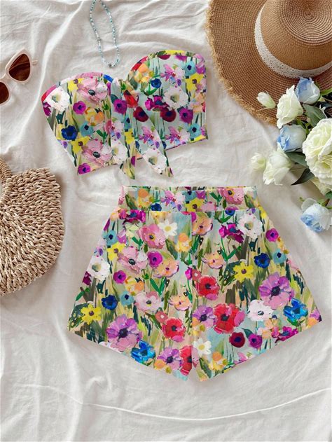 Multicolor Floral Print Micro Crop Bandeau And Shorts Set In Soft Knitted Fabric Floral 2 Pieces Set 2 Pieces Set Summer Two Pieces Set Women Multicolor Multicolor Floral Two Pieces Set,XS